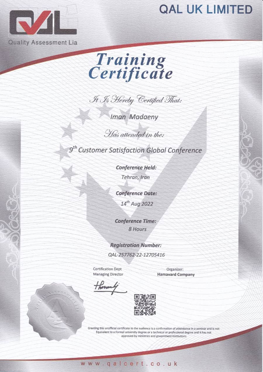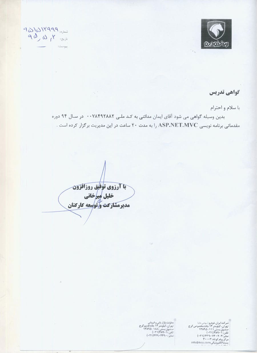 دارای مدارک Microsoft Certified Trainer – MCT وMCSD و MCP و MCSE و MCSA از مایکروسافت که در رزومه قابل مشاهده می باشد . ( مشاهده مدارک )